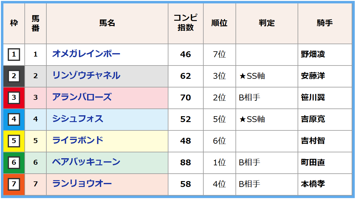 結果は「★SS軸」のリンゾウチャネルが1着、同じく「★SS軸」のシシュフォスが2着となり、「B相手」のアランバローズが3着となりました。3連単の配当は1万1,640円でした。
