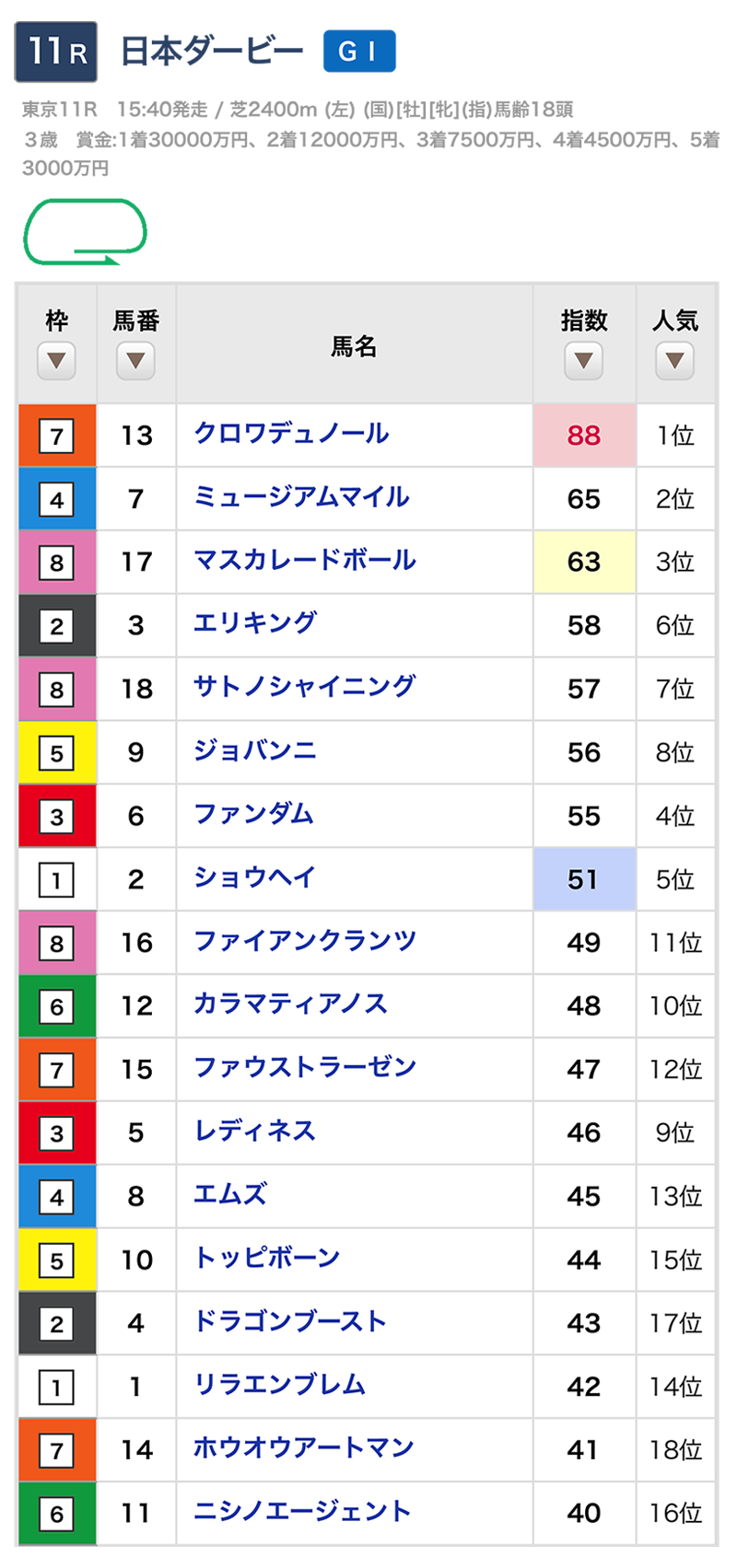 指数1位のクロワデュノールは「88」で、2位ミュージアムマイルの「65」とは「23」の指数差があり「絶対的な軸馬」といえました。
